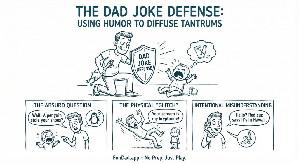 Master the art of diffused tantrums with the ultimate dad weapon: Comedy. Learn how absurdity and humor can reset a toddler's brain.