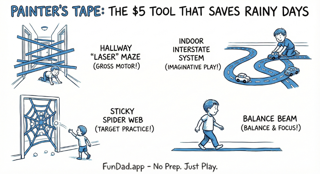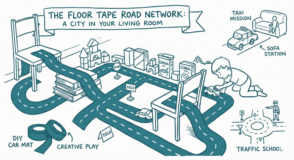 Transform your living room into a sprawling metropolis with just a roll of blue painter’s tape. Infinite, customizable, and low-mess car play.