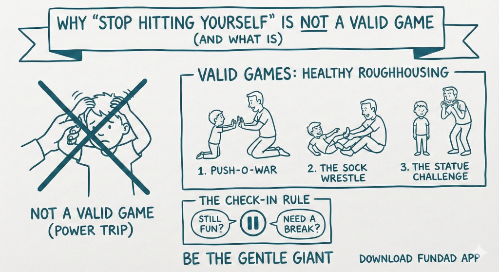 Learn why forcing your kid to hit themselves isn't a game and discover 3 healthy roughhousing alternatives that build connection.