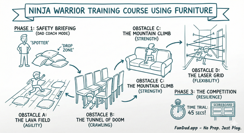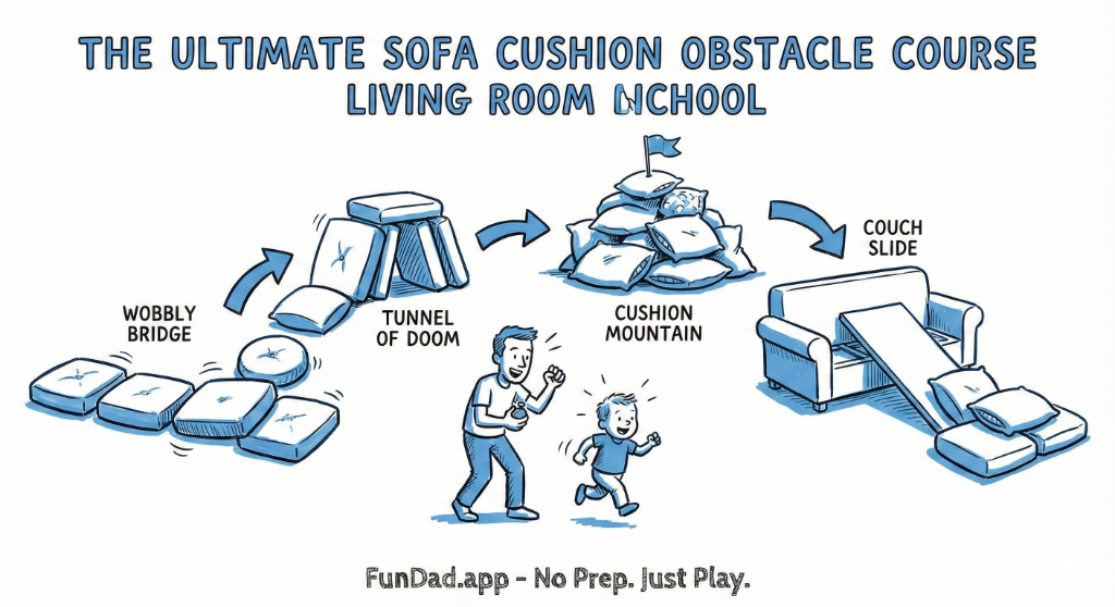 Transform your living room into a high-intensity obstacle course using everyday furniture.