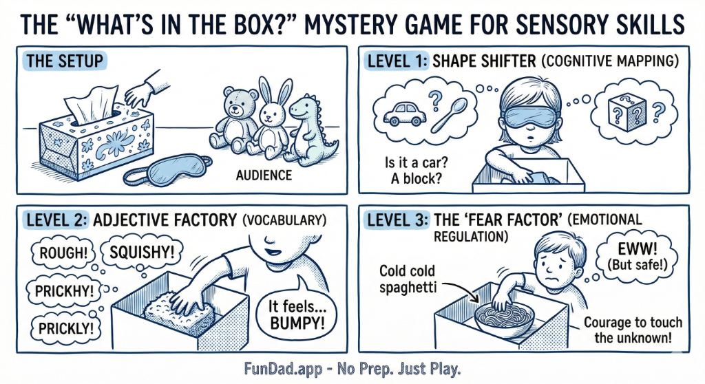 A sophisticated lesson in tactile sensory play, logical deduction, and vocabulary expansion disguised as a hilarious game show challenge.