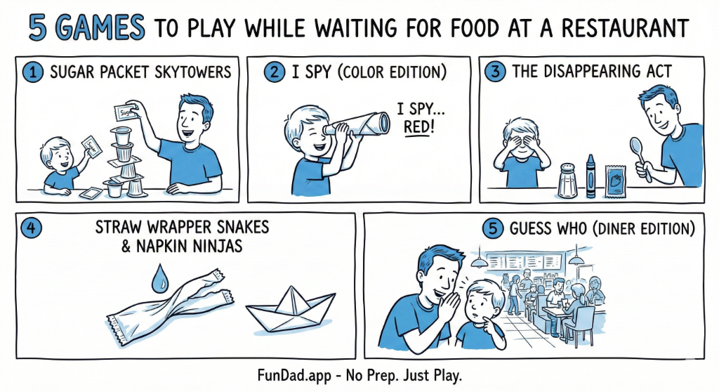 Now begins the most dangerous phase of dining out with children: The Wait. Here are 5 waiting games for kids using only what’s in front of you.